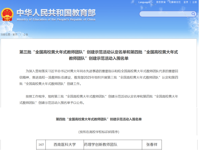 9月5日,教育部正式公布第四批“全国高校黄大年式教师团队”创建示范活动入围名单,我校张春祥教授领衔的“药理学创新教师团队”入选第四批“全国高校黄大年式教师团队”创建示范活动入围名单,成为我校首个“全国高校黄大年式教师团队”。